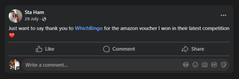 A Huge Thank you to @WhichBingoUK for my Amazon voucher that I won in your recent giveaway. I am thrilled to have won. Thank you also for your great communication and sending over my prize so quickly! Absolutely brilliant! Thank you! #WhichBingo pic.twitter.com/1woTpC7dYD