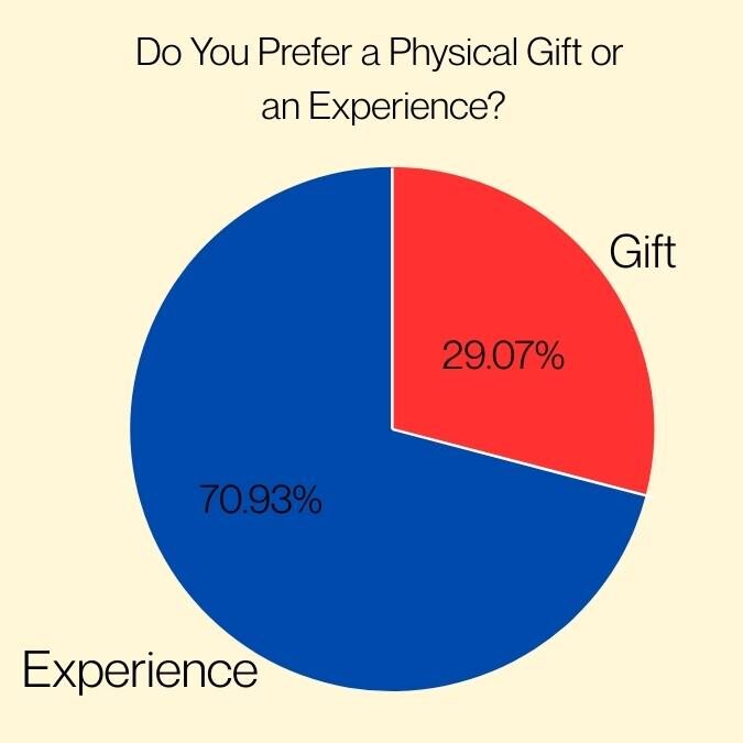 The most striking finding from the data is the overwhelming preference for memories over merchandise. When asked whether they prefer a physical gift or an experience, a staggering 70.9% of respondents chose experiences.