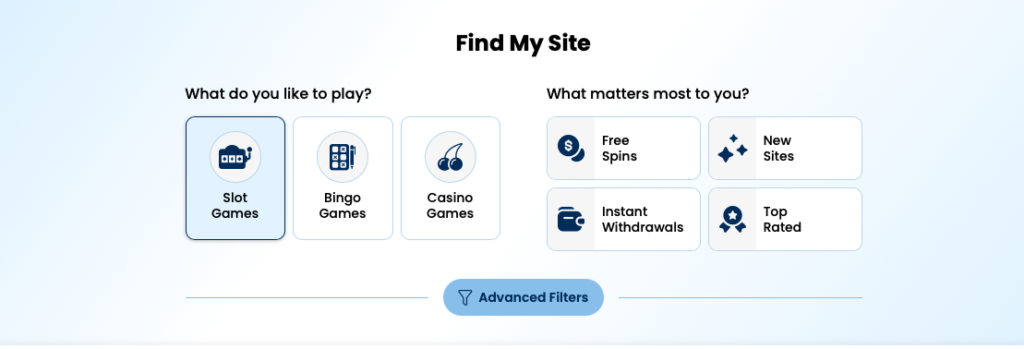 Just tell us what you’re into (slots, bingo, casino games), plus what matters most (free spins? instant withdrawals? brand-new sites?) and we’ll serve up a recommendation that fits how you actually play.