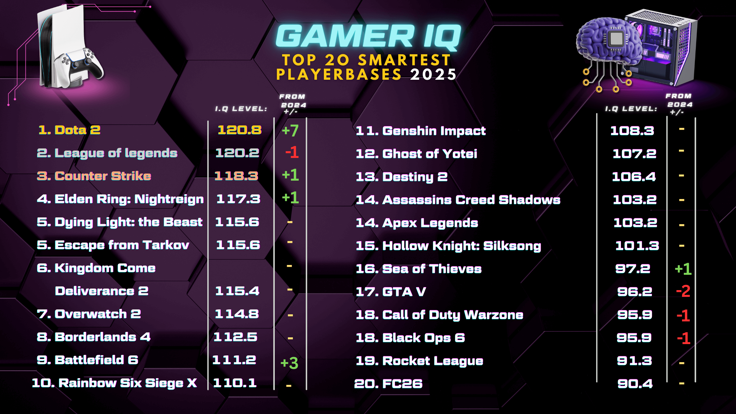 Compared to the 2024 survey, there are some notable changes with Dota 2 climbing seven places to take top spot as 2024’s results saw an average IQ of 111.7. League of Legends remained strong with its second-place finish after scoring an average of 120.4 while Counter Strike and Elden Ring: Nightreign still remained high in the poll with average IQ scores last year of 116.1 and 114.6 respectively.